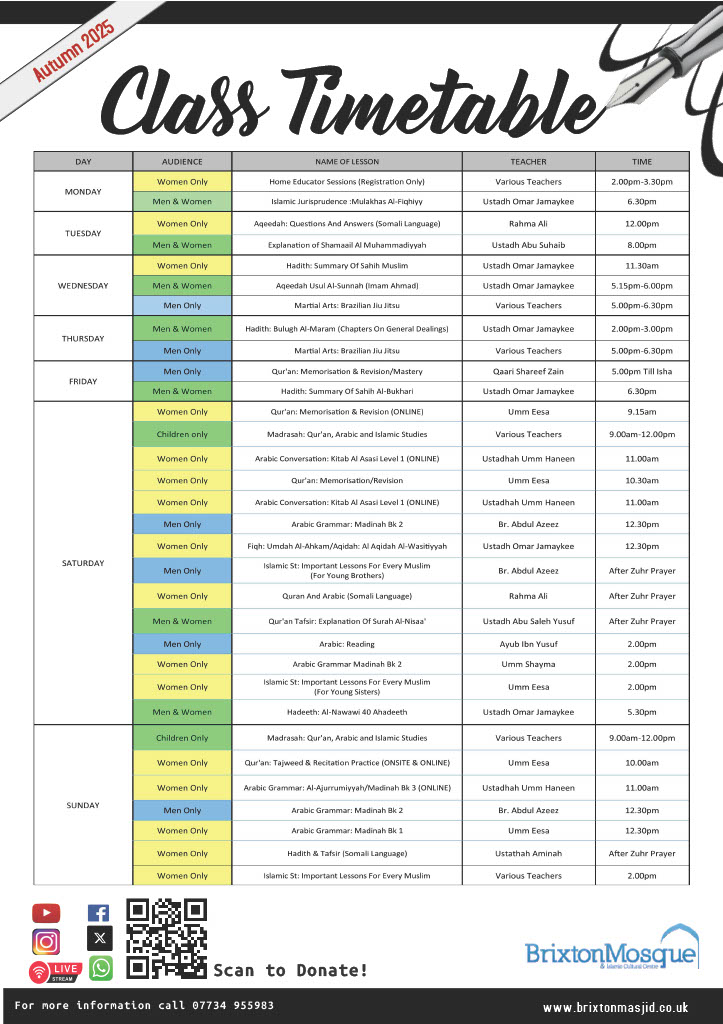 π’ Brixton Masjid Weekly Classes Update
